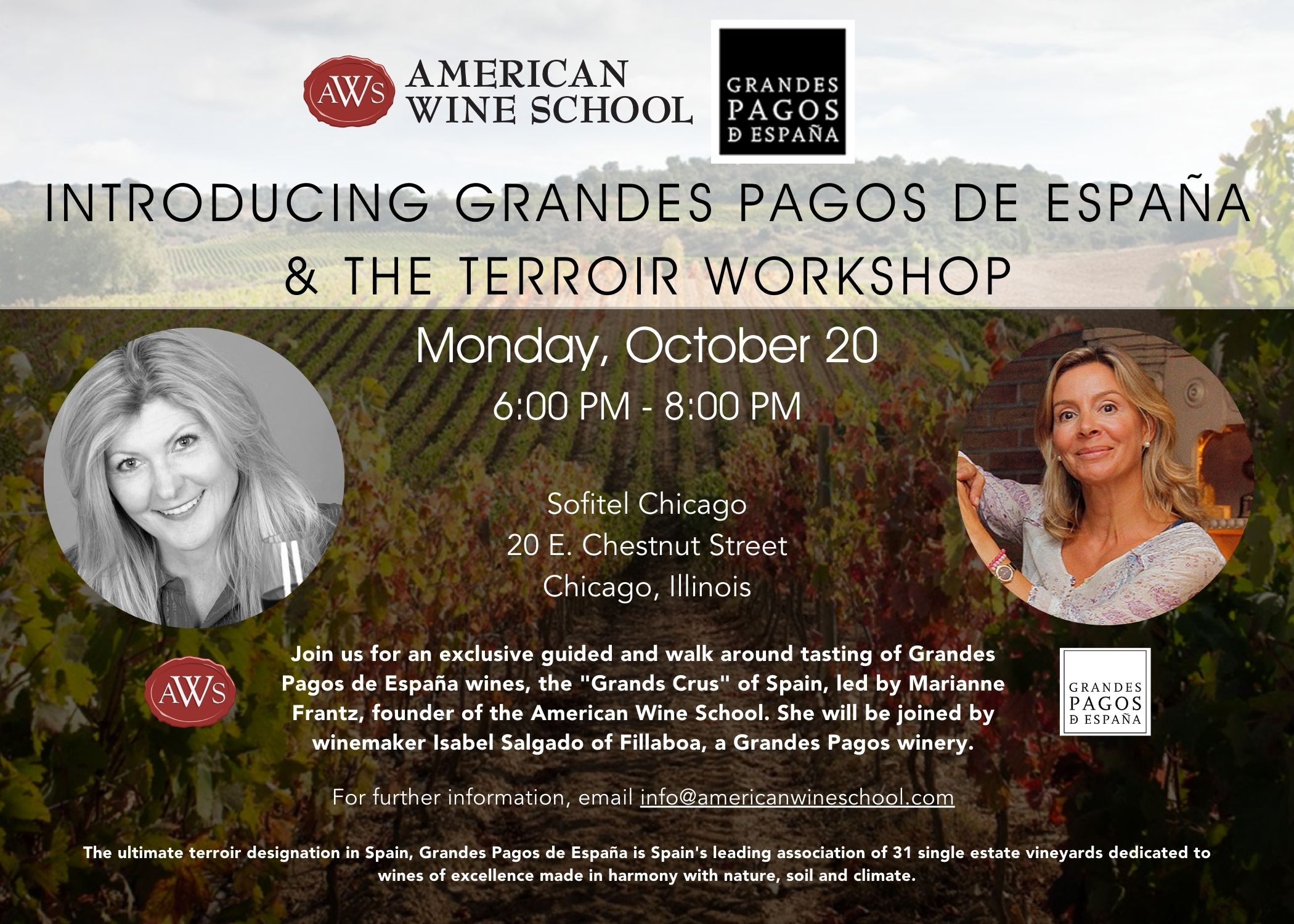 Join us for an exclusive guided and walk-around tasting of Grandes Pagos de España wines, the “Grand Crus” of Spain led by Marianne Frantz, founder of the American Wine School. She will be joined by winemaker Isabel Salgado of Fillaboa, a Grandes Pagos winery. The ultimate terrior designation in Spain, Grandes Pagos de España is Spain’s leading association of 31 single estate vineyards dedicated to wines of excellence made in harmony with nature, soil, and climate.